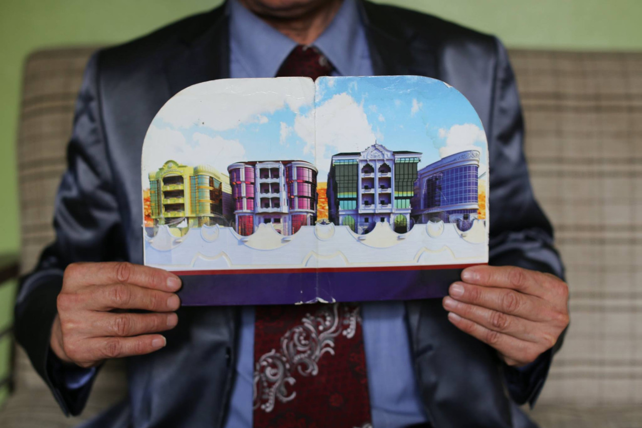 “I built this compound for my family. I saved the money for it, I designed it myself, and I oversaw the construction. The first missile tore through the yellow house and exploded inside the pink house. It was a government anti-personnel missile. They are not supposed to be used in residential areas. Inside were 116 small bombs, and each bomb was filled with needles and shrapnel. The pink house belonged to my brother and his entire family was torn to pieces. The second missile landed in the green house but did not explode. That was my house. If the missile had exploded, I wouldn’t have any children left. But it only destroyed the top floor where my wife and daughter were. Sixteen people died in the attack. Seven were from my family.“